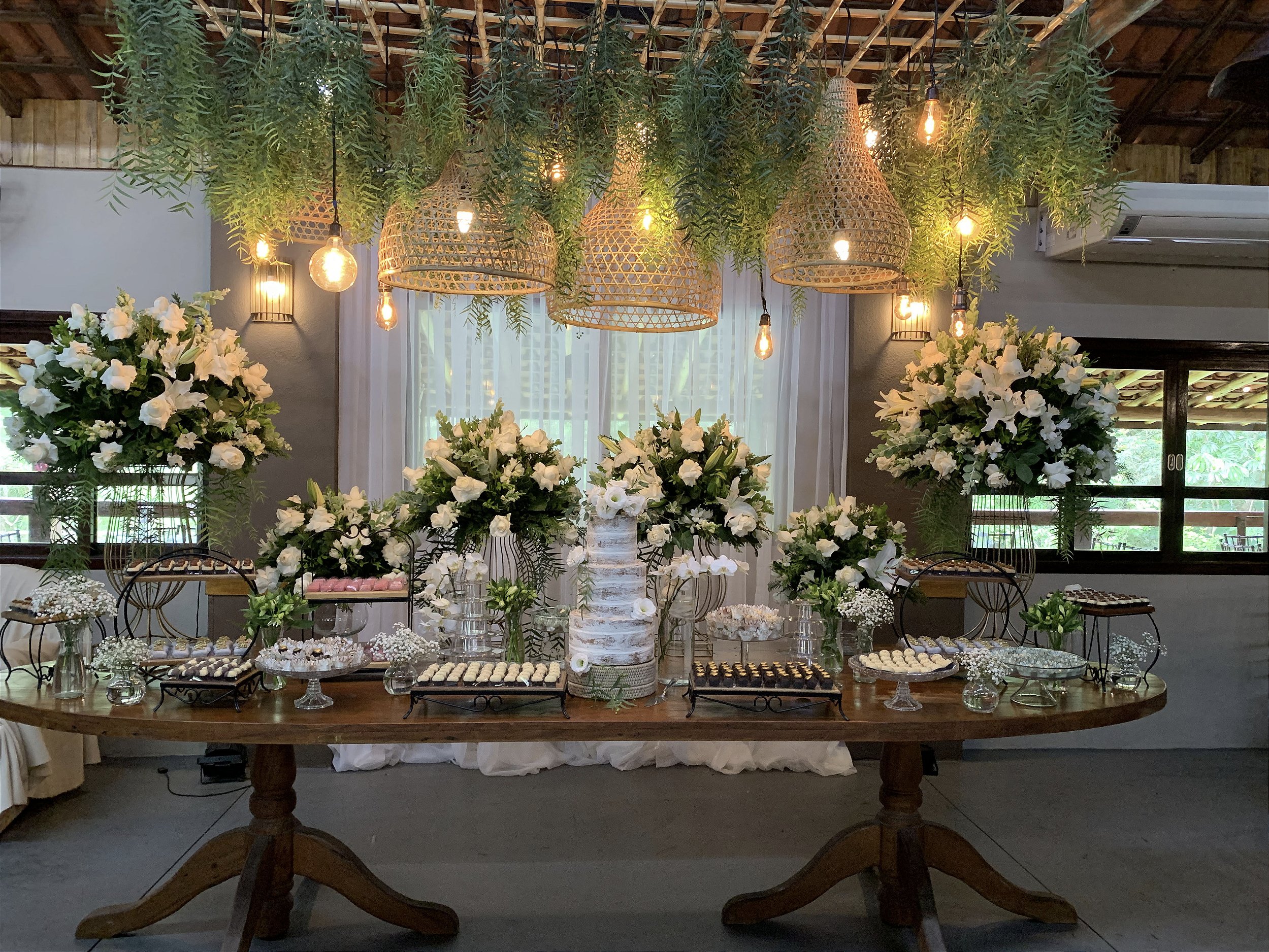 Encante seus convidados com a "Mesa de Doces Elegante", uma decoração de salão que une o charme rústico à sofisticação! Esta composição apresenta uma mesa de madeira adornada com arranjos florais brancos exuberantes, combinados com delicadas folhagens pendentes e luminárias artesanais de vime, criando um ambiente acolhedor e mágico. O bolo rústico e os doces finos, dispostos em suportes elegantes, complementam a estética, enquanto as cortinas brancas ao fundo adicionam um toque de leveza. Perfeita para casamentos e eventos especiais, esta decoração promete transformar sua celebração em um momento de puro encanto e requinte, com uma atmosfera que mistura natureza e elegância!